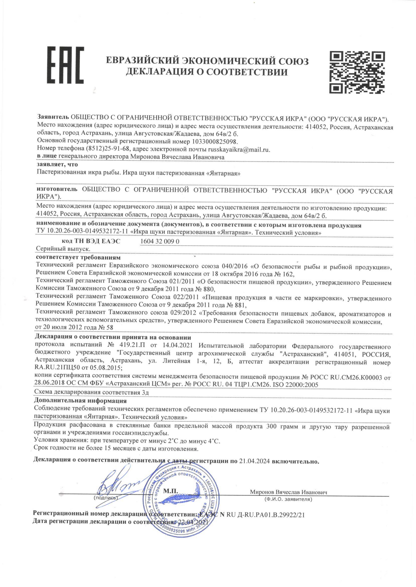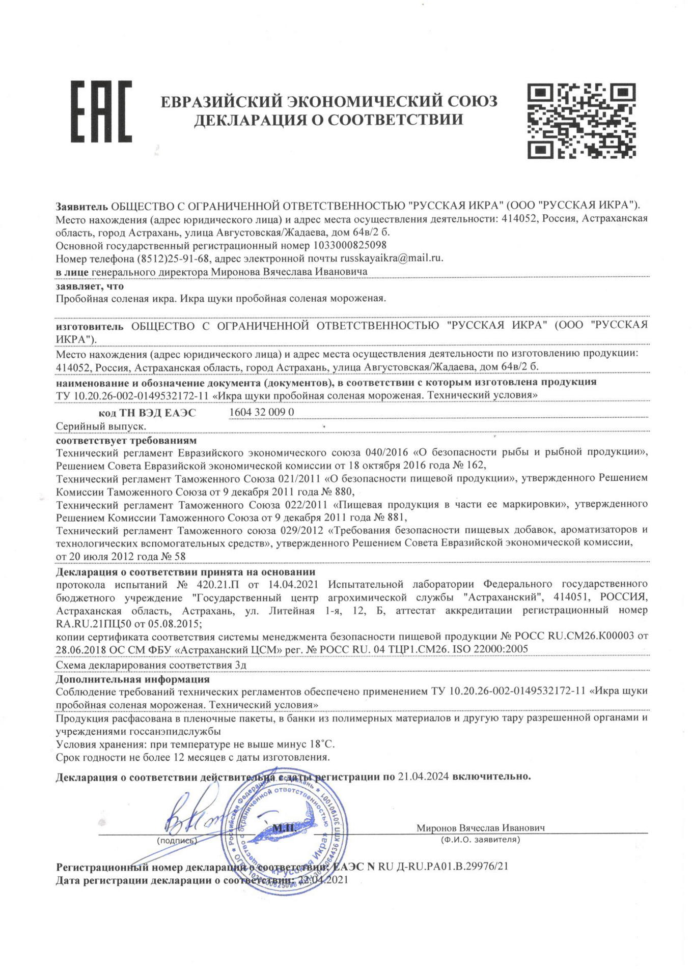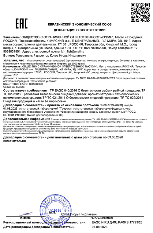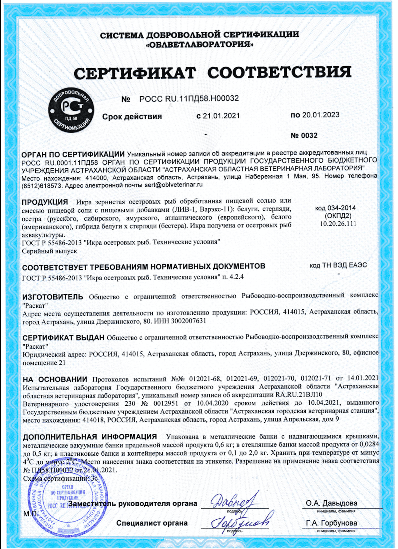 Мы добавляем в икру соль, только в кол-ве 3,7% (малосол) и пищевую добавку Варекс 11. Данная добавка обеспечивает микробиологическую безопасность осетровой икры, сохранность от окисления жира и горечи готовой продукции. Вы получаете свежую, чистую и вкусную икру